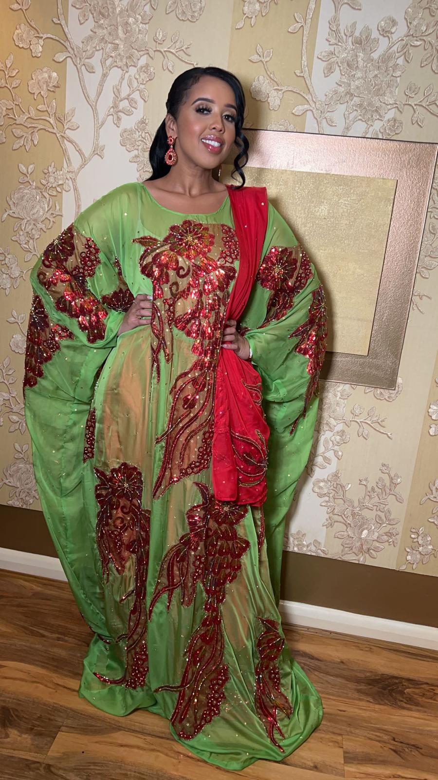 Finch Yellow Green and Red Silk Chiffon Somali Dirac Set